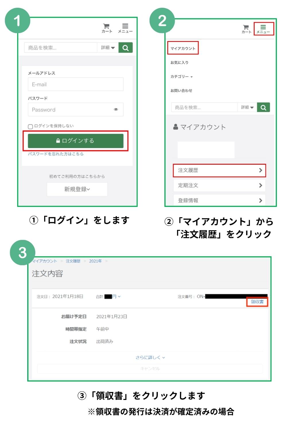 領収書が必要な方は、マイアカウント > 注文内容 > 注文番号の下からダウンロードが出来ます。
